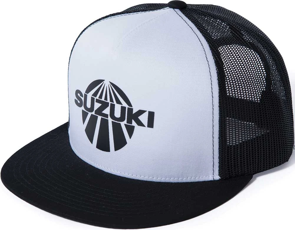 The Suzuki Vintage Snap-back Hat features a black snap-back hat with the vintage Suzuki logo screen printed on the front panel.